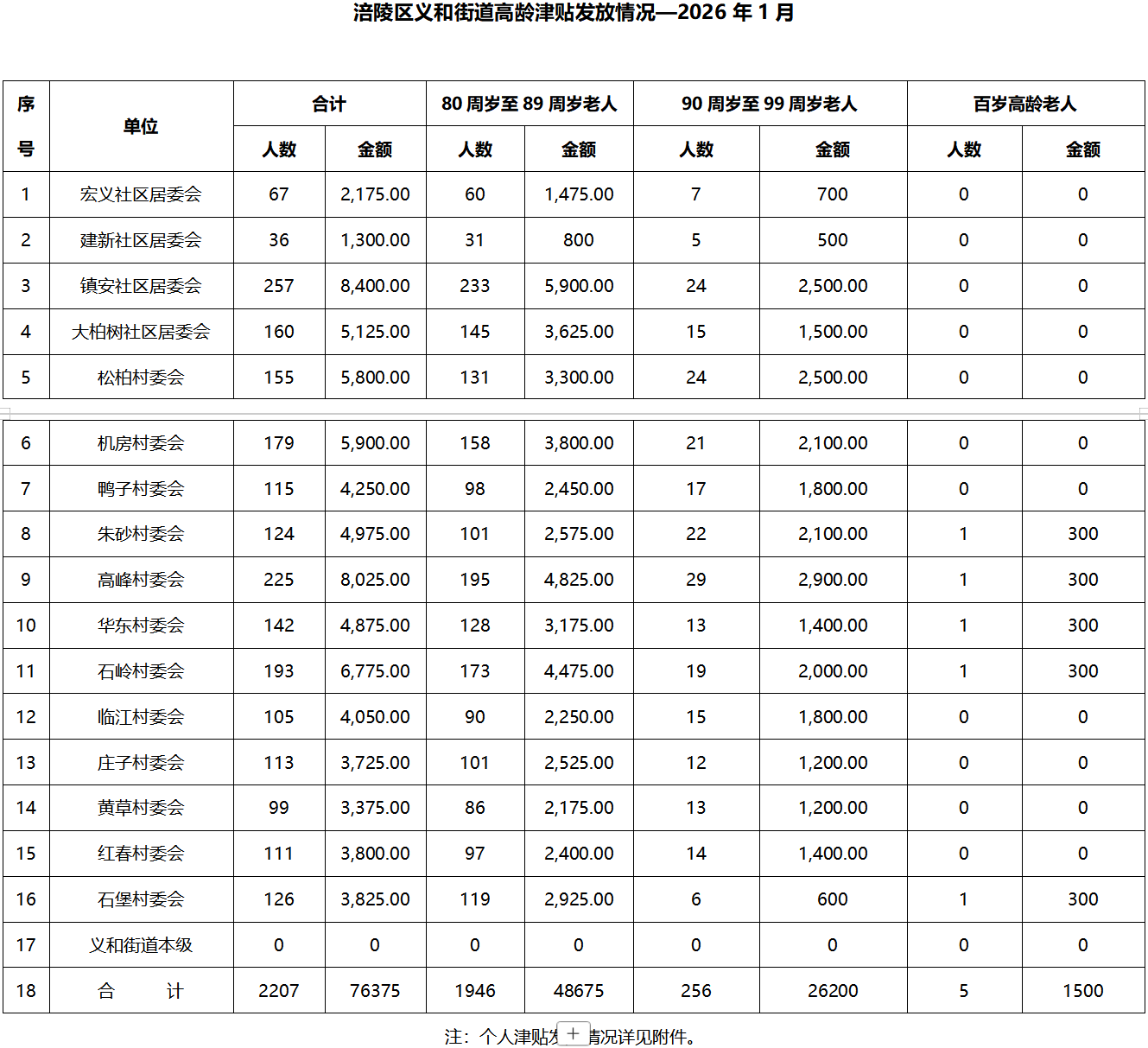 涪陵区义和街道2026年1月高龄津贴发放情况