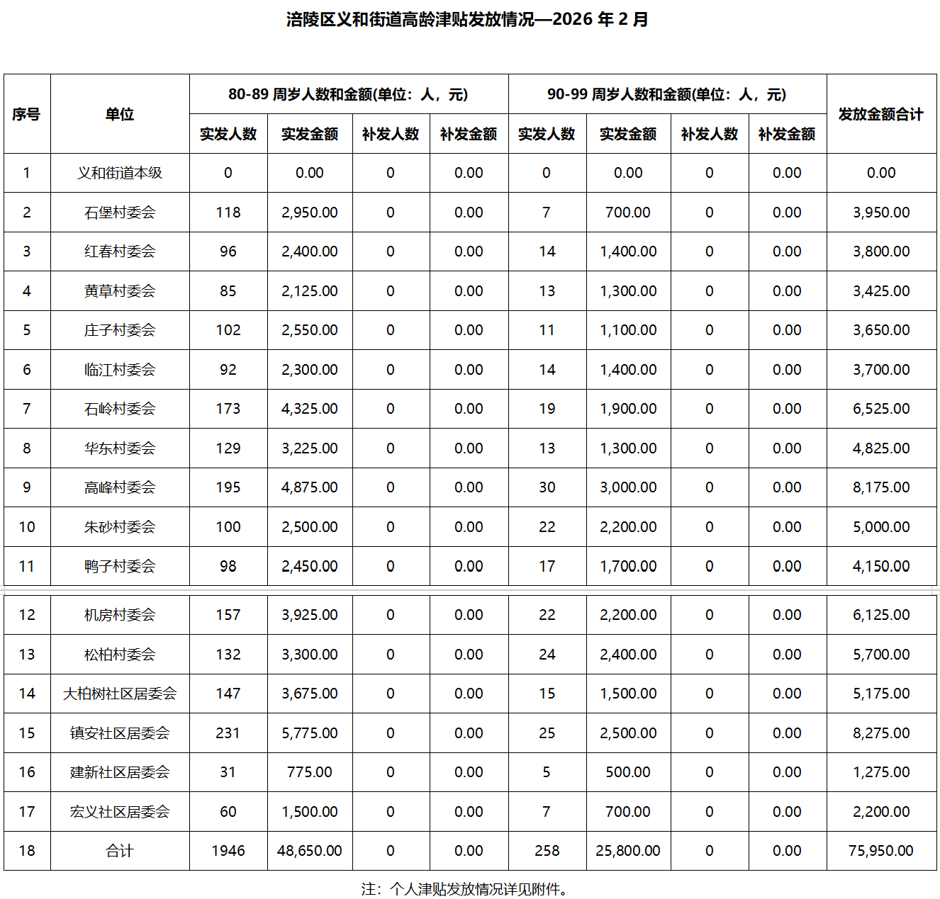 涪陵区义和街道2026年2月高龄津贴发放情况