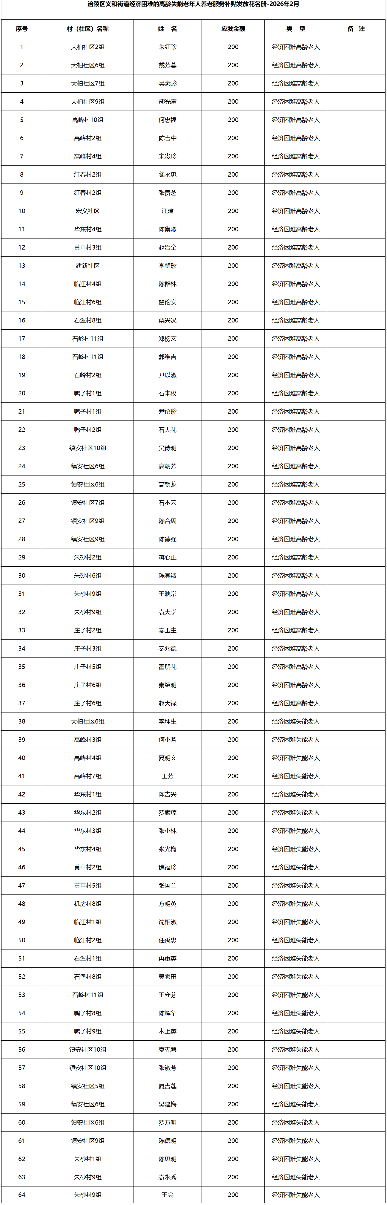 涪陵区义和街道2026年2月经济困难的高龄失能老年人养老服务补贴发放花名册