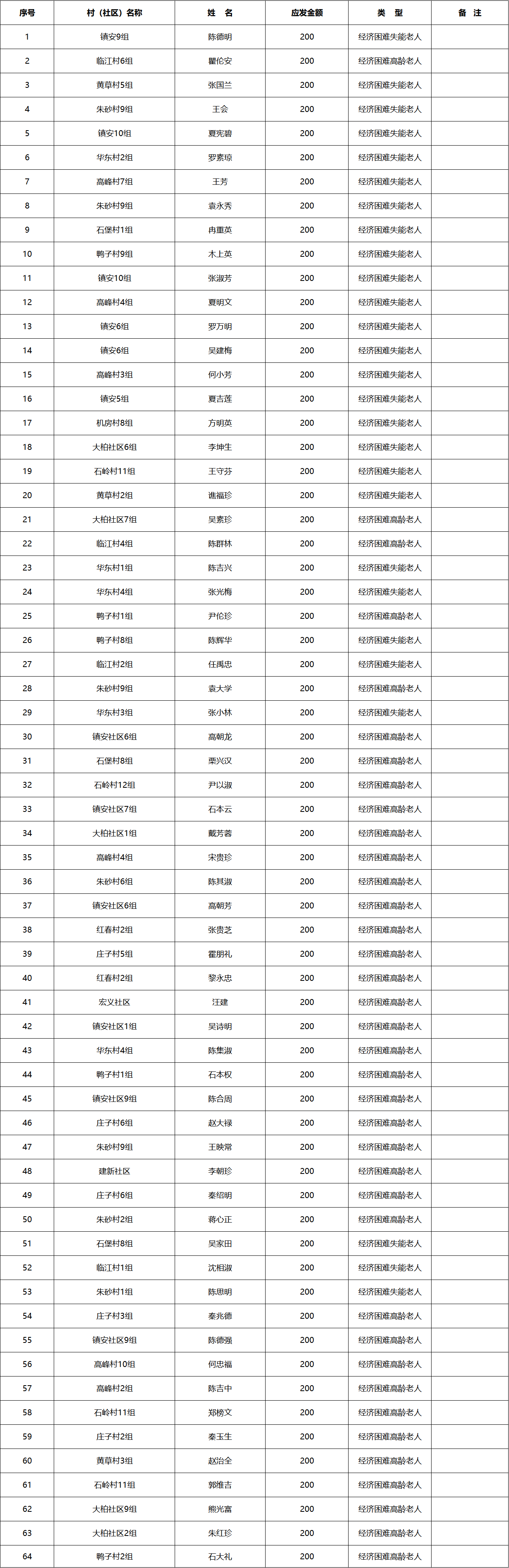 涪陵区义和街道2025年3月经济困难的高龄失能老年人养老服务补贴发放花名册