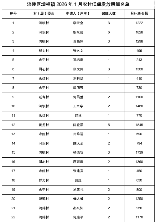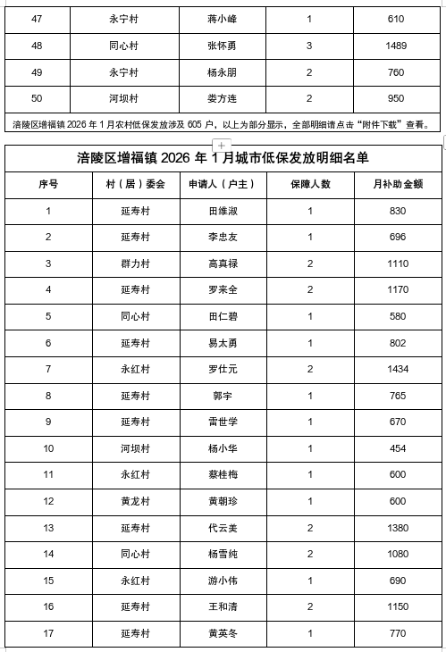 涪陵区增福镇2026年1月城乡低保个人发放明细表