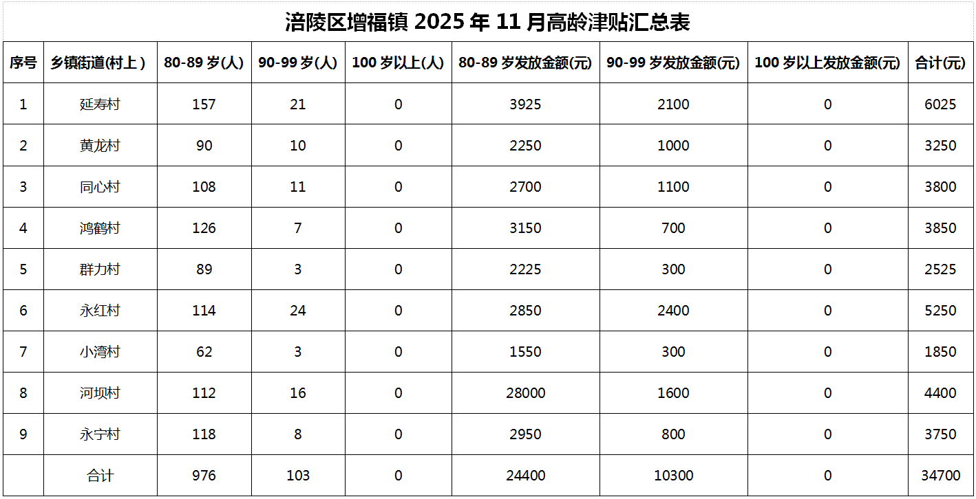涪陵区增福镇2025年11月高龄津贴发放情况