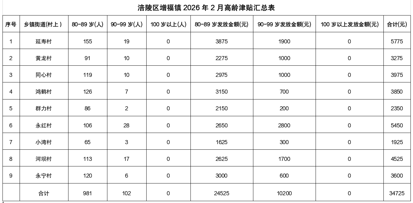 涪陵区增福镇2026年2月高龄津贴发放情况
