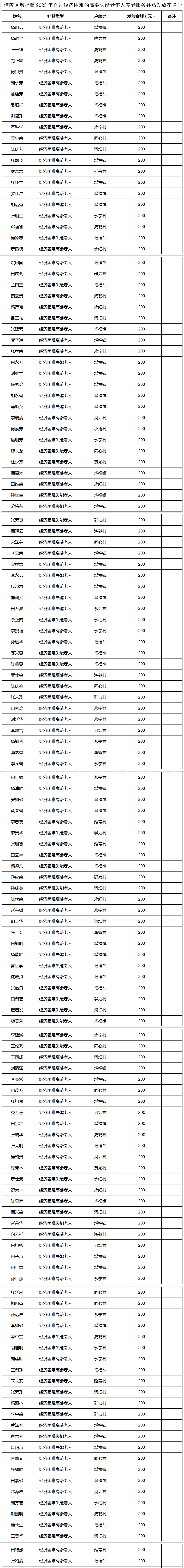 涪陵区增福镇2025年8月经济困难的高龄失能老年人养老服务补贴发放花名册