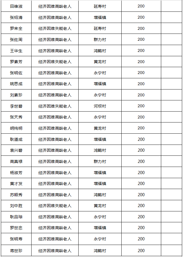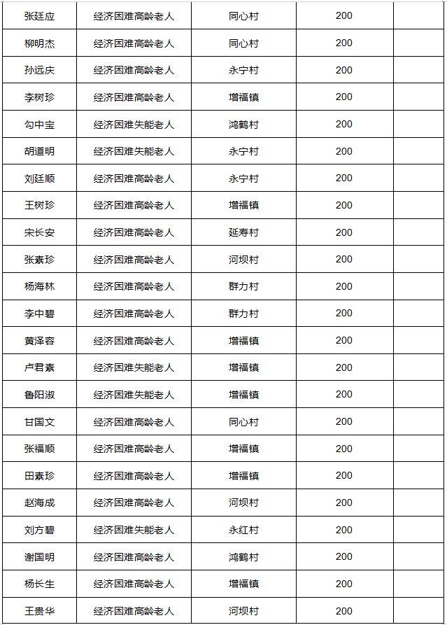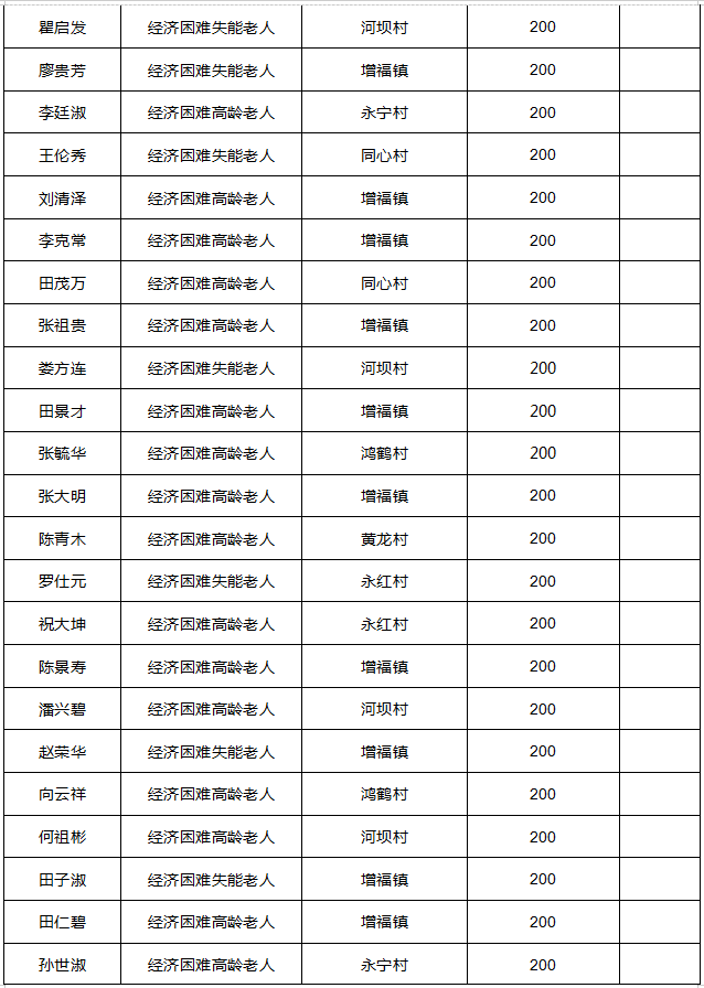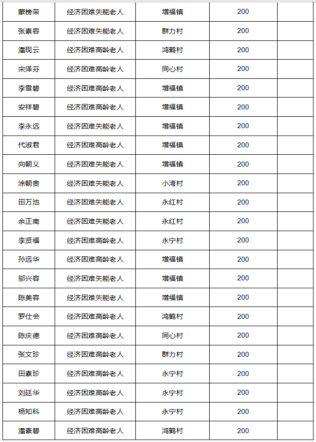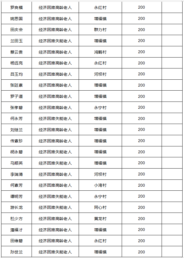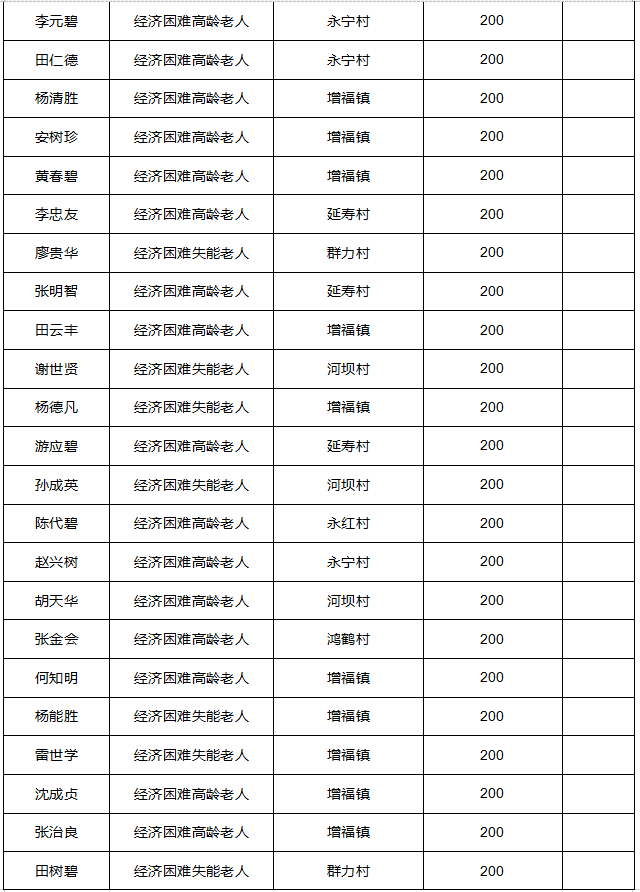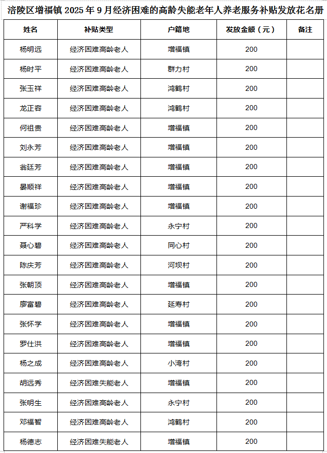 涪陵区增福镇2025年9月经济困难的高龄失能老年人养老服务补贴发放花名册