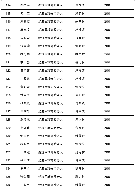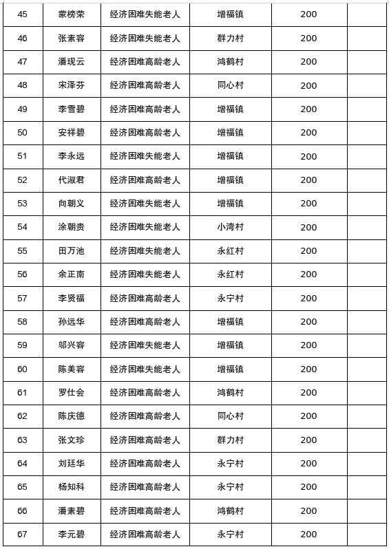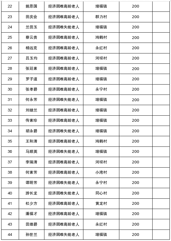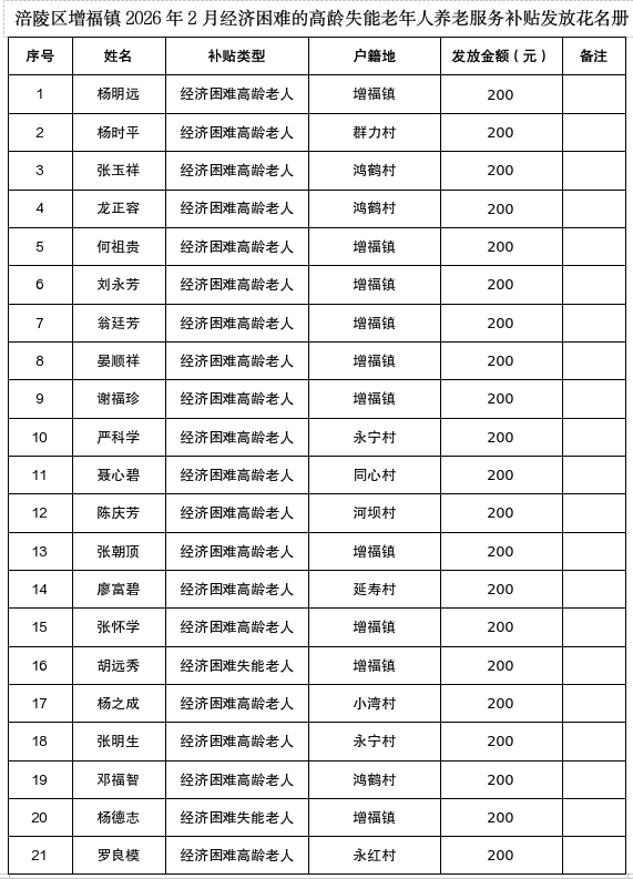 涪陵区增福镇2026年2月经济困难的高龄失能老年人养老服务补贴发放花名册