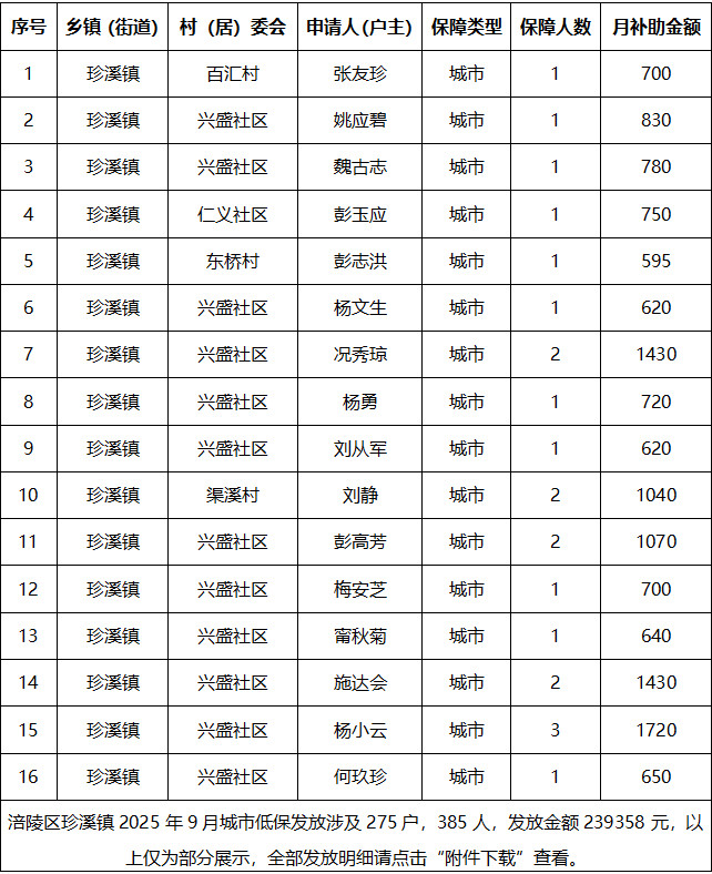涪陵区珍溪镇2025年9月城市低保发放明细表
