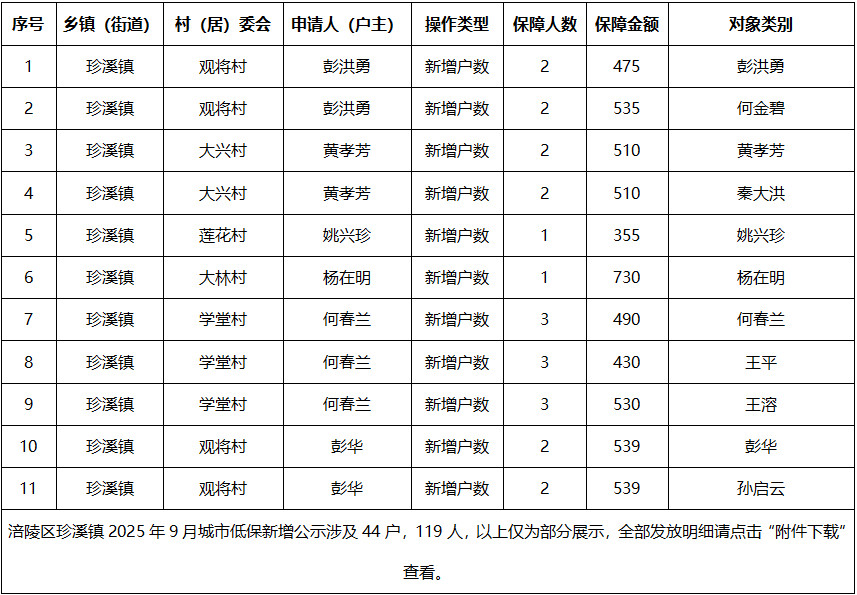 涪陵区珍溪镇2025年9月低保人员新增公示