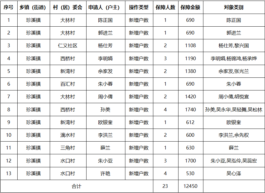涪陵区珍溪镇2025年10月低保人员新增公示