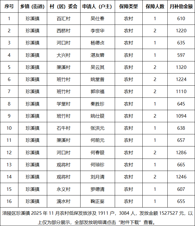 涪陵区珍溪镇2025年11月农村低保发放明细表