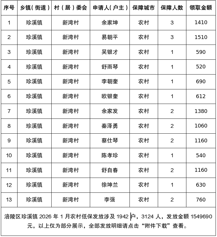 涪陵区珍溪镇2026年1月农村低保发放明细表