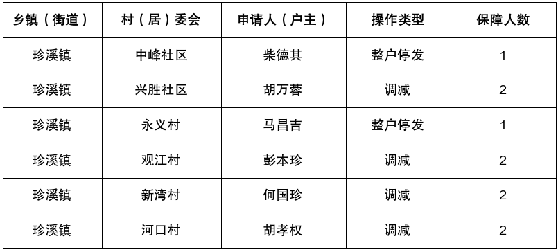 涪陵区珍溪镇2026年1月低保人员调减、停发公示