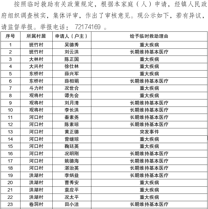 涪陵区珍溪镇2026年1月临时困难救助公示