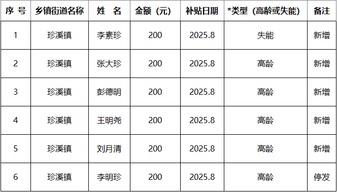 涪陵区珍溪镇2025年8月经济困难高龄失能老年人养老服务补贴新增、停发名单