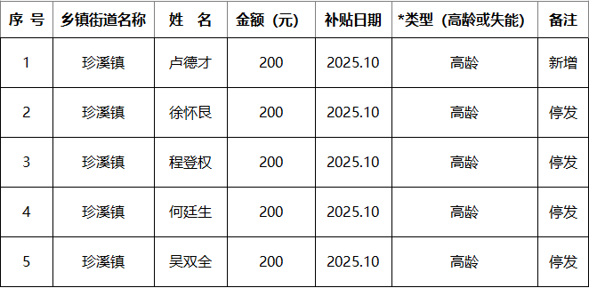 涪陵区珍溪镇2025年10月经济困难高龄失能老年人养老服务补贴新增、停发名单
