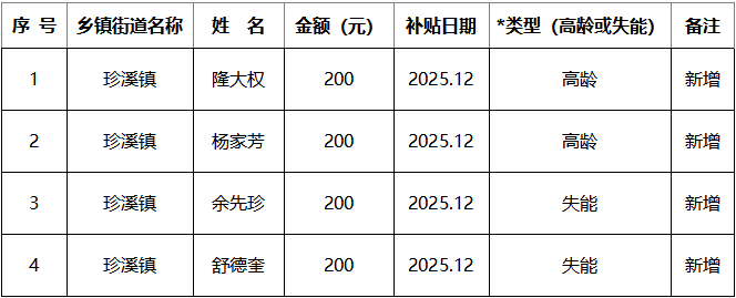 涪陵区珍溪镇2025年12月经济困难高龄失能老年人养老服务补贴新增、停发名单