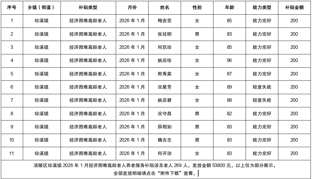 涪陵区珍溪镇2026年1月经济困难高龄老人养老服务补贴结果公示