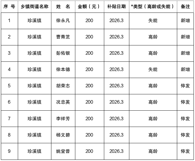 涪陵区珍溪镇2026年3月经济困难高龄失能老年人养老服务补贴新增、停发名单