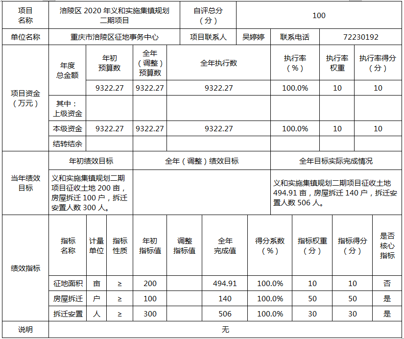 涪陵区2020年义和实施集镇规划二期项目绩效目标自评综述:根据重庆市人民政府《关于涪陵区实施城镇规划建设农用地转用和土地征收的批复》(渝府地〔2017〕2032号)要求,2020年我中心完成义和实施集镇规划二期项目土地征收494.91亩,房屋拆迁140户。项目全年预算9322.27万元,执行数为9322.27万元,完成率100.0%。实施情况:自项目启动以来,我中心指导义和镇对征地范围进行调查,协议签订、补偿安置、办理参保,整个过程符合我区集体土地征收政策规定。对要件不齐、资料不完整的及时予以补充纠正。在整个征地过程中,绝大多数群众理解、支持、配合,群众满意度高,幸福感、获得感显著增强。