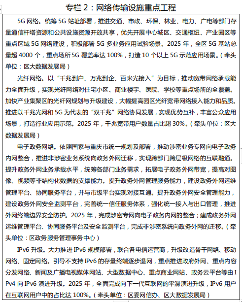打造智能泛在的网络体系,助力人与物、人与人之间的信息传递、使用、决策,促进信息产业的整体发展与垂直行业的创新发展,为智慧城市运行注入新动能。打造高水平通信网络,加快5G网络规模化部署,推进固网宽带向全光网络的迁移改造,争取建设双千兆示范区域。全面推进IPv6规模部署,提升端到端覆盖率,实现网络、应用、终端全面支持IPv6。加快推动(重庆)国际互联网数据专用通道对涪陵高新区的接入授牌,提升涪陵区国际通信服务能力。构建一体化政务服务网络,加快部门业务梳理和专网整合,提升政务外网的服务承载及安全保障水平,构建牢固、畅通、共享、高效的基础政务网络,具备跨层级、跨地域、跨系统、跨部门、跨业务的支撑服务能力。