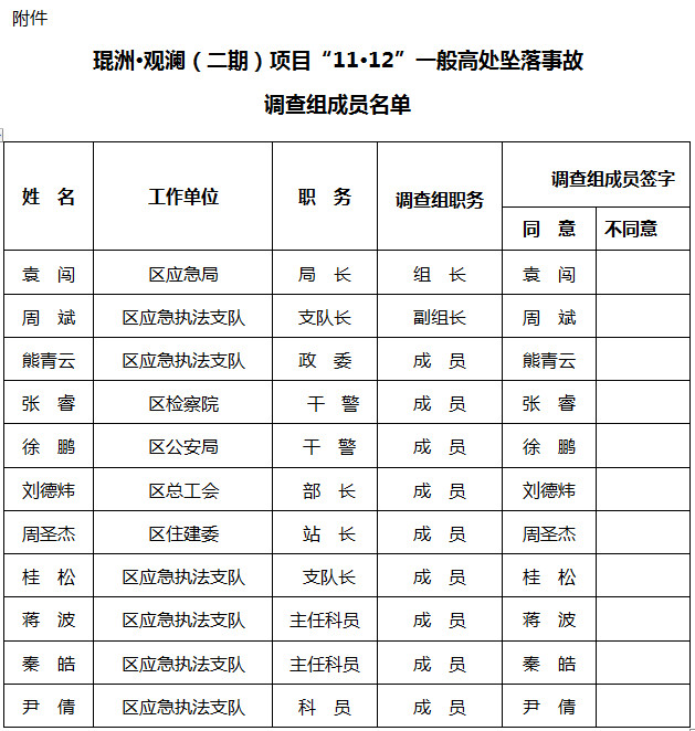 附件:琨洲•观澜(二期)项目“11·12”一般高处坠落事故调查组成员名单