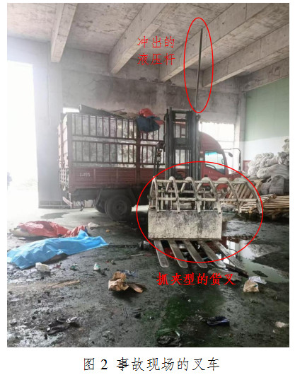 事故发生时正在进行叉车装卸货作业,叉车货叉似抓夹型,货叉已落至地面,且地面有大量血迹,叉车左侧液压油缸内的液压杆冲出。(图2)