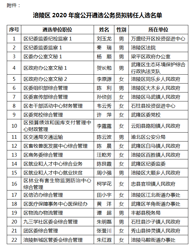 附件:涪陵区2020年度公开遴选公务员拟转任人选名单
