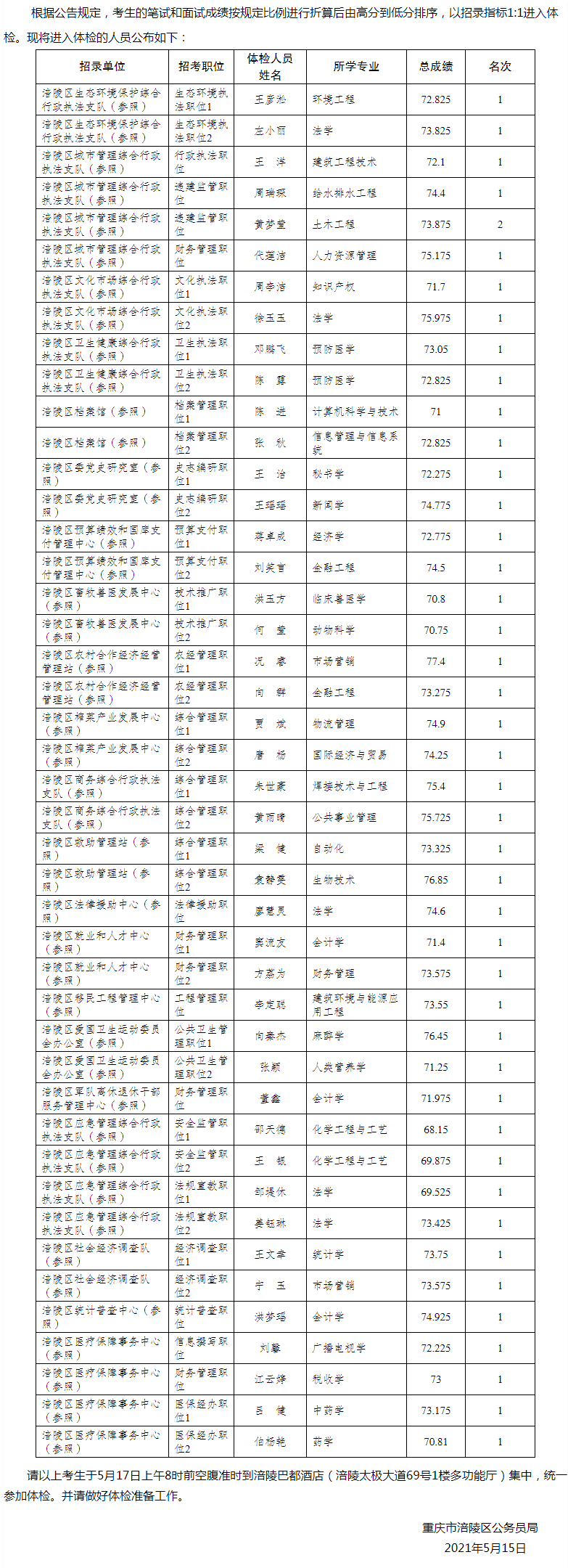 重庆市涪陵区2021年度公开考试录用公务员参加体检人员公布(第一批)