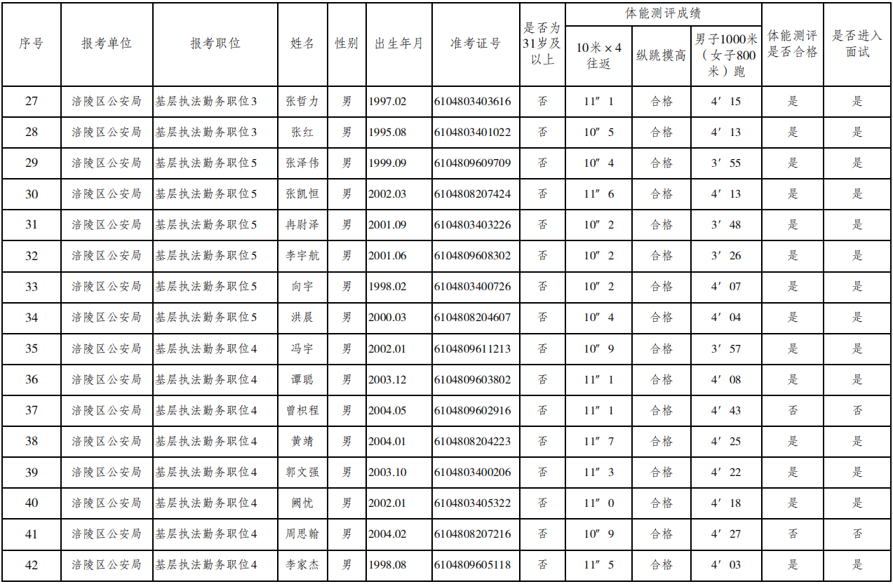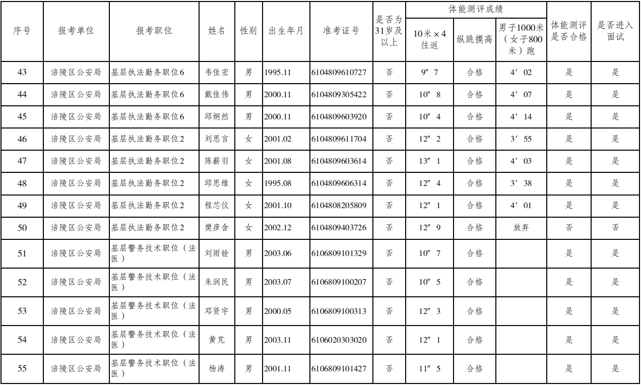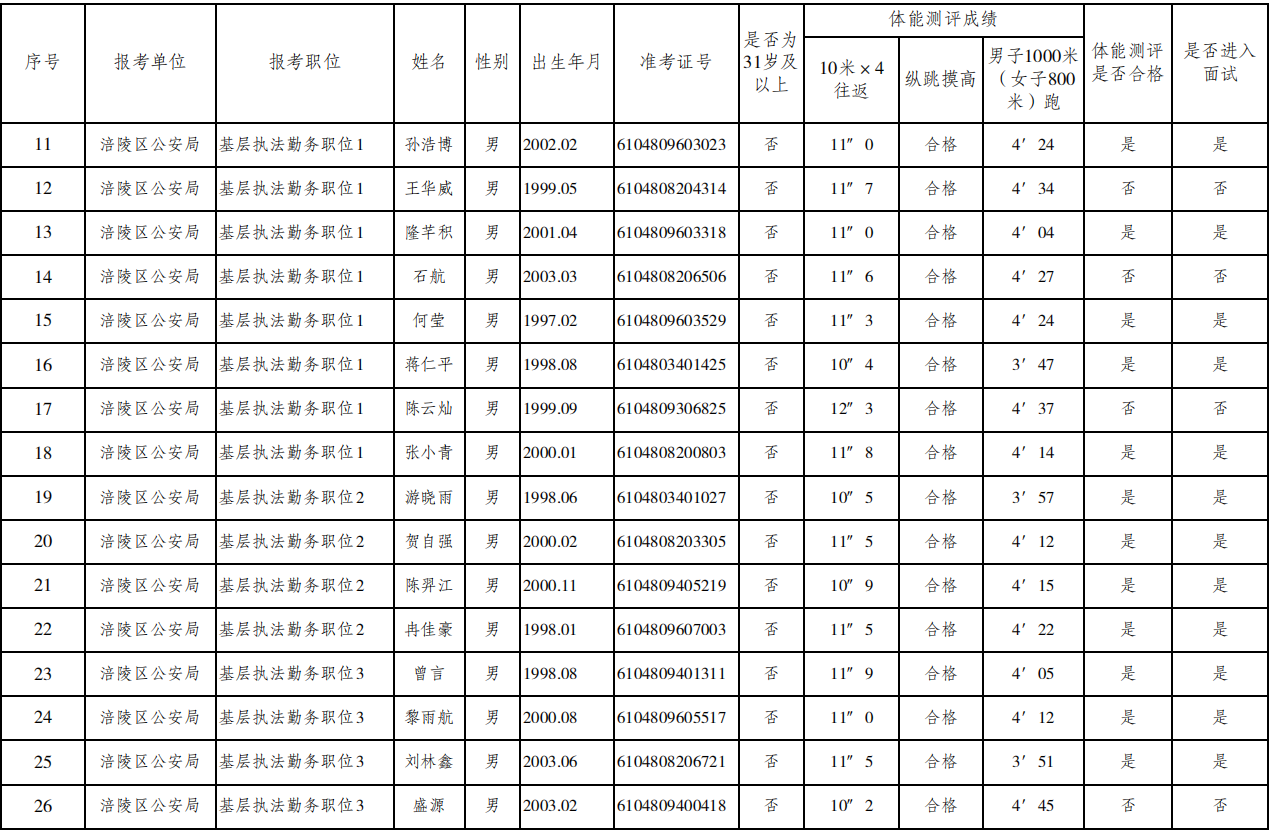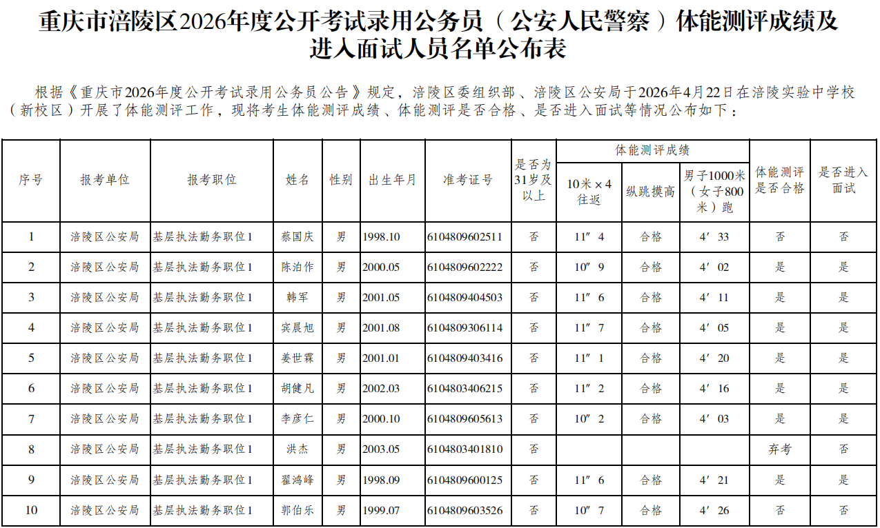 重庆市涪陵区2026年度公开考试录用公务员(公安人民警察)体能测评成绩及进入面试人员名单公布表
