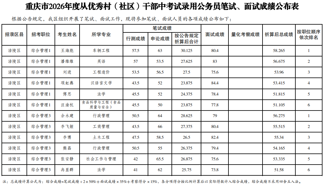 重庆市2026年度从优秀村(社区)干部中考试录用公务员笔试、面试成绩公布表