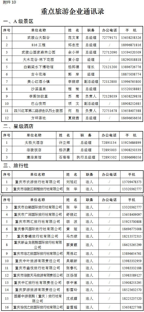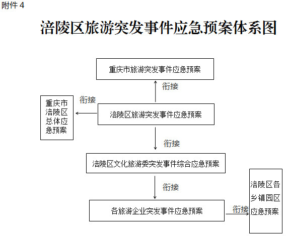 涪陵区旅游突发事件应急预案,是涪陵区旅游突发事件应急预案体系建设的总纲,是应对旅游突发事件的整体方案、规范程序和行动指南。按照分类管理、分级响应的原则,各旅游企业要结合本单位实际制定本级突发事件应急预案,并与区政府各有关部门和属地乡镇街道的应急预案相衔接,并遵循“下级服从上级,专项、部门服从总体,预案之间不得相互矛盾”的原则。(见附件4)