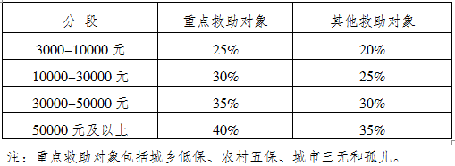 (一)起付及封顶线。原则上符合条件的单次自负费用超过3000元以上的,可享受救助;每人每年最高救助额度不超过5万元。