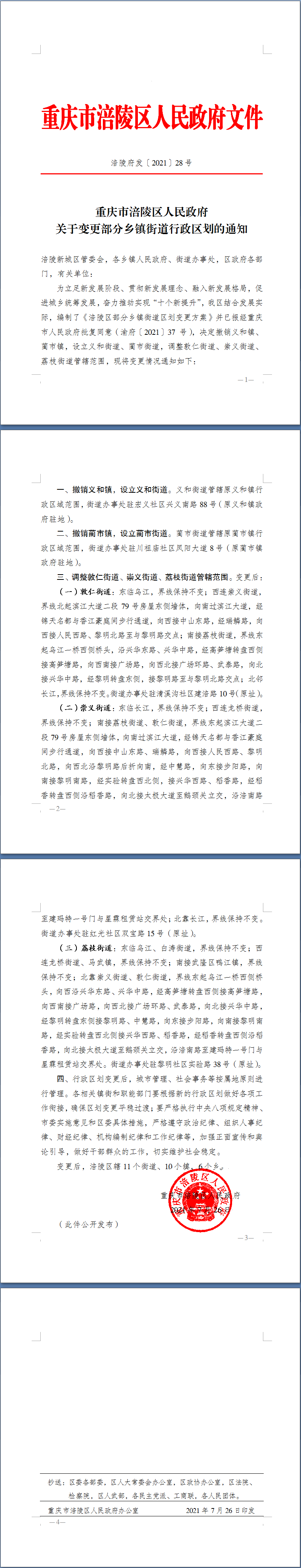 重庆市涪陵区人民政府 关于变更部分乡镇街道行政区划的通知(涪陵府发〔2021〕28号 )