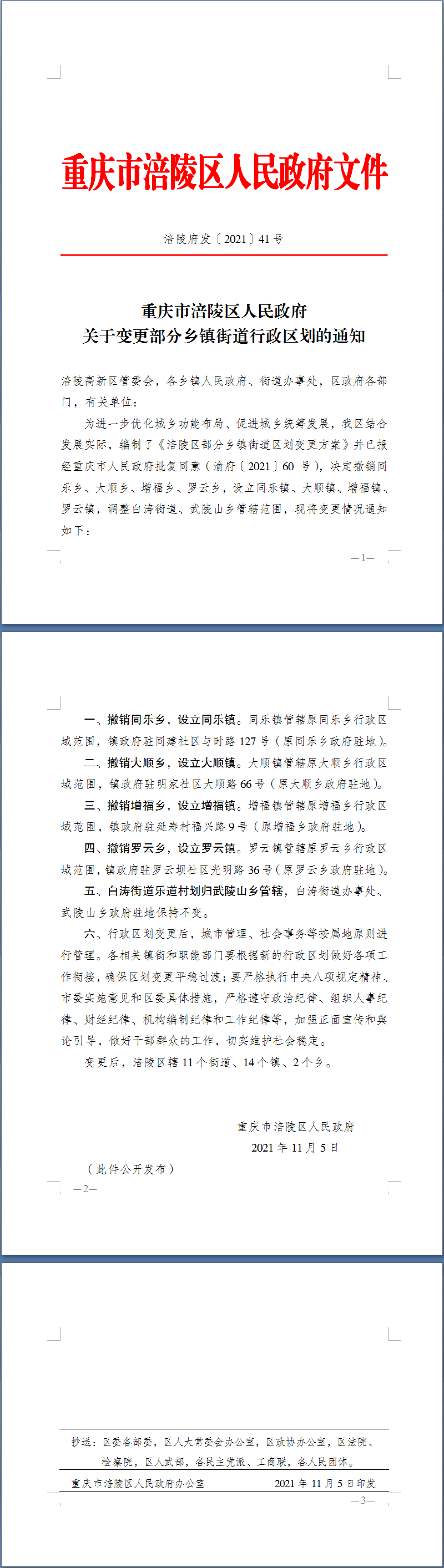 重庆市涪陵区人民政府 关于变更部分乡镇街道行政区划的通知(涪陵府发〔2021〕41 号)