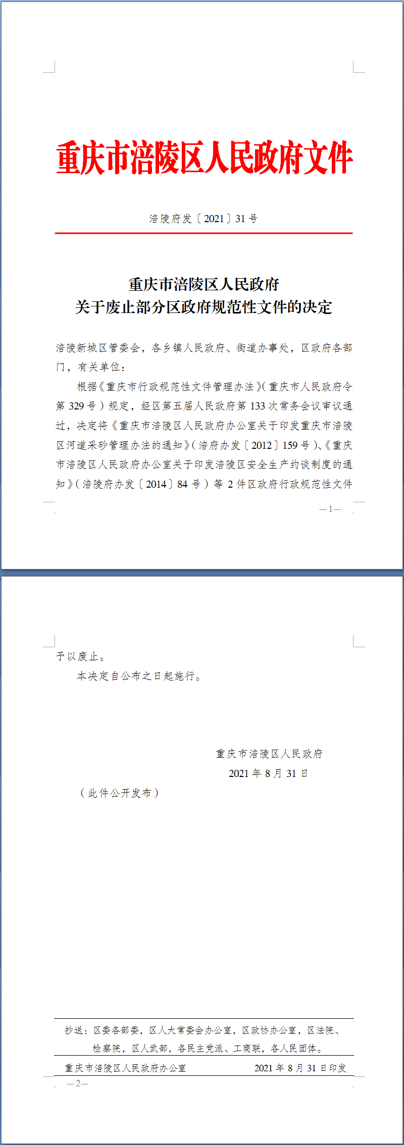 重庆市涪陵区人民政府 关于废止部分区政府规范性文件的决定