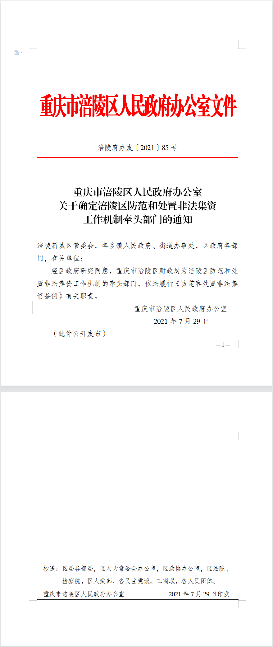 重庆市涪陵区人民政府办公室 关于确定涪陵区防范和处置非法集资工作机制牵头部门的通知
