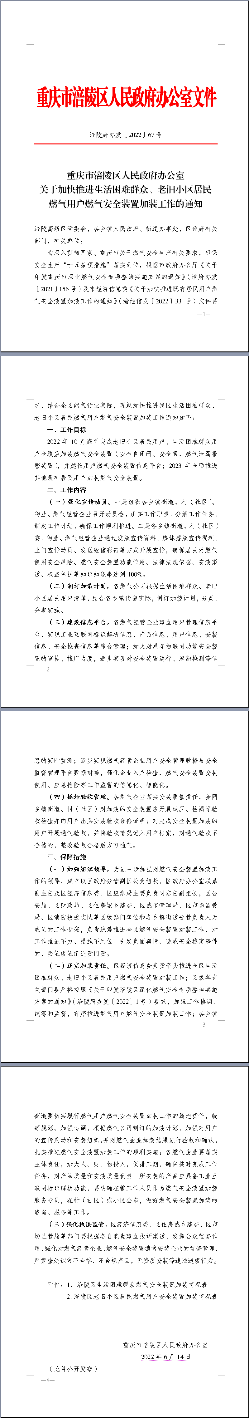 重庆市涪陵区人民政府办公室 关于加快推进生活困难群众、老旧小区居民 燃气用户燃气安全装置加装工作的通知