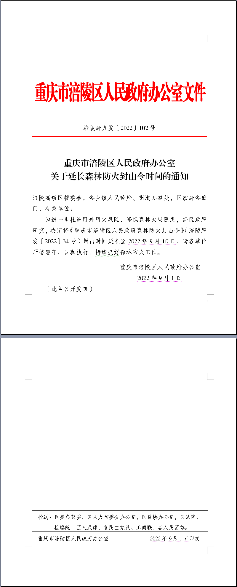 重庆市涪陵区人民政府办公室 关于延长森林防火封山令时间的通知