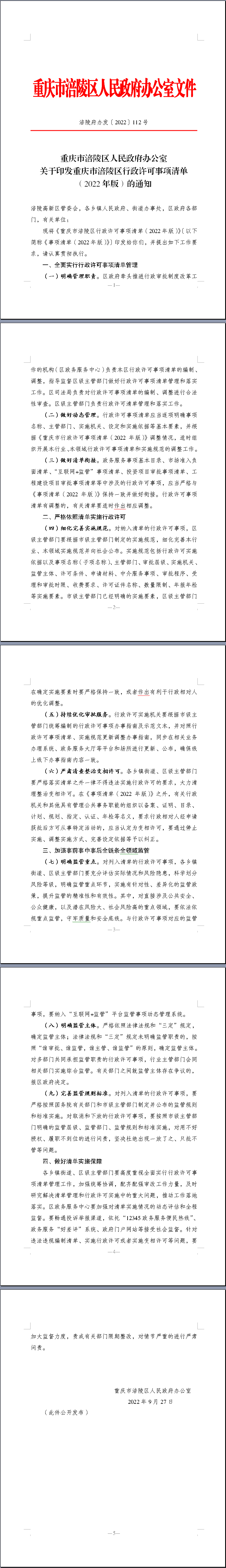 重庆市涪陵区人民政府办公室 关于印发重庆市涪陵区行政许可事项清单 (2022年版)的通知