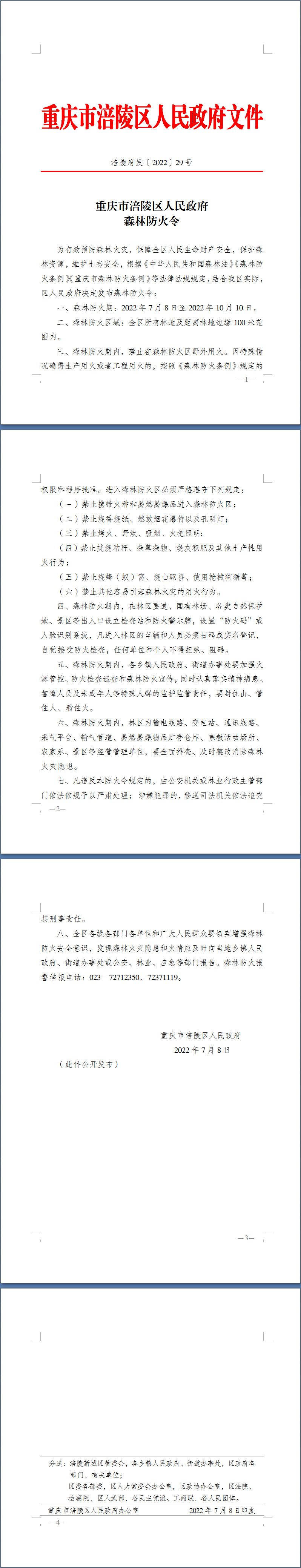 重庆市涪陵区人民政府森林防火令