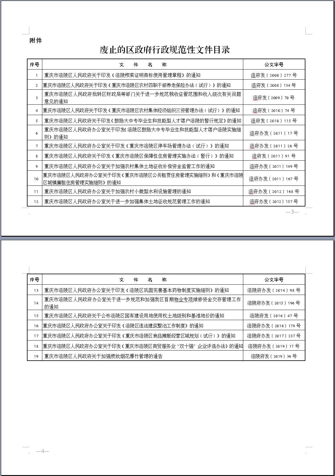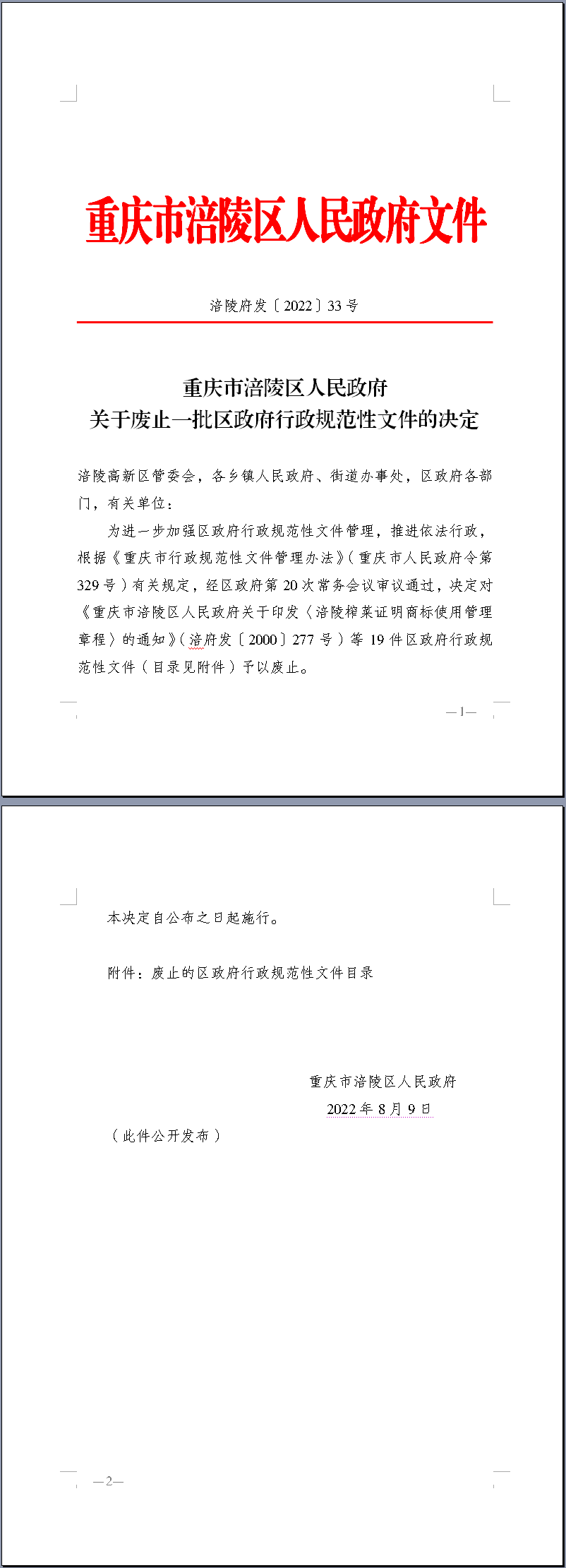 重庆市涪陵区人民政府 关于废止一批区政府行政规范性文件的决定