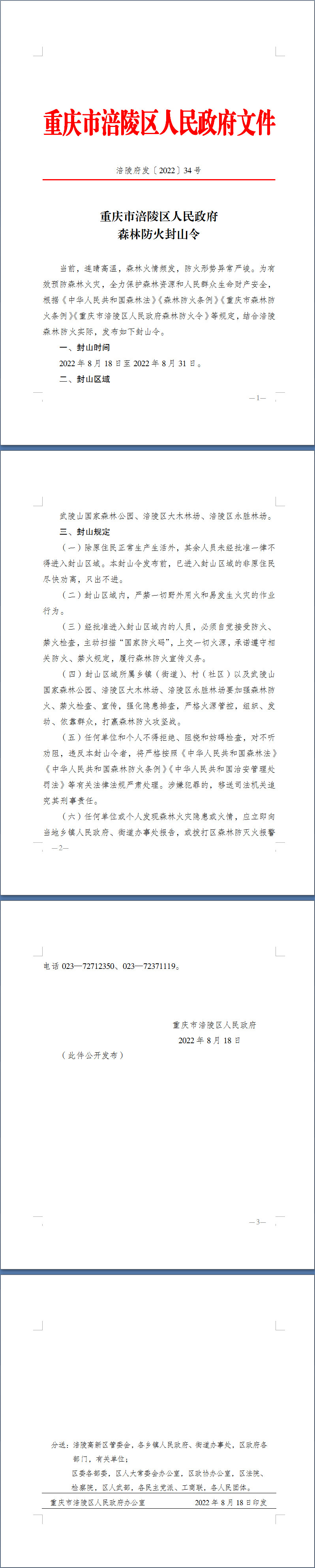 重庆市涪陵区人民政府森林防火封山令