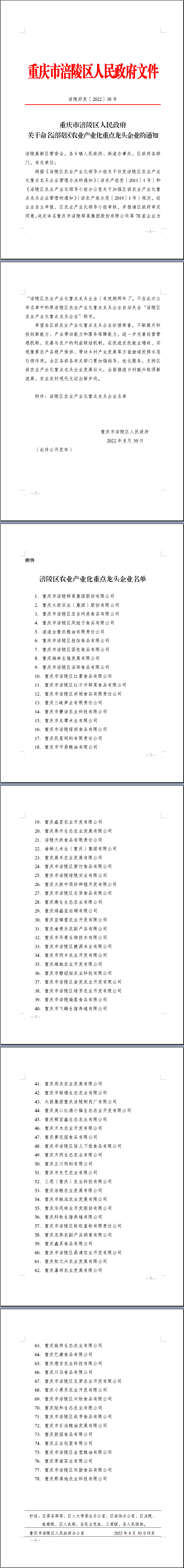 重庆市涪陵区人民政府 关于命名涪陵区农业产业化重点龙头企业的通知