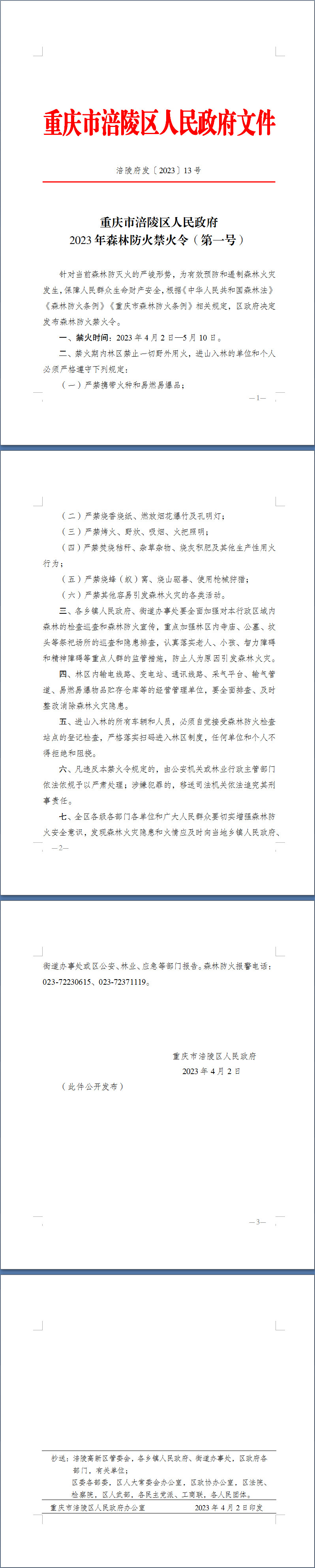 重庆市涪陵区人民政府2023年森林防火禁火令(第一号)