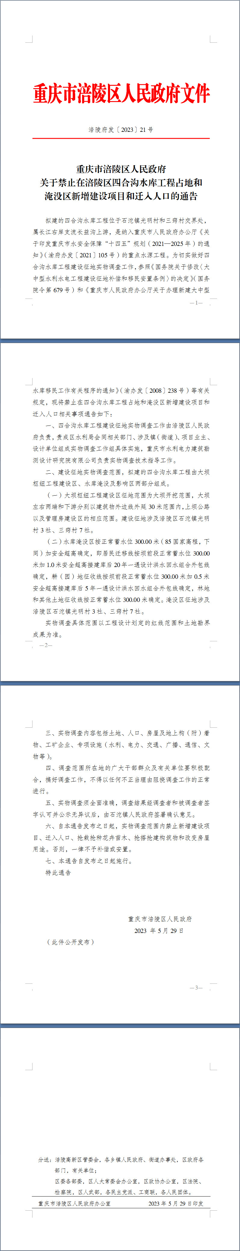 重庆市涪陵区人民政府 关于禁止在涪陵区四合沟水库工程占地和淹没区新增建设项目和迁入人口的通告