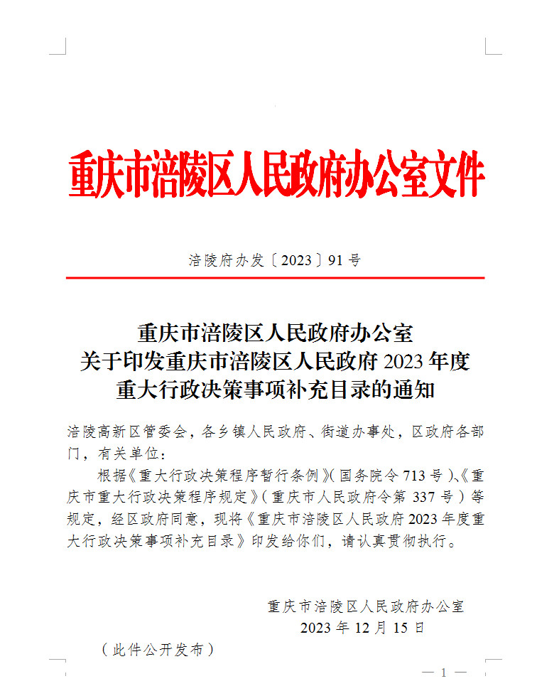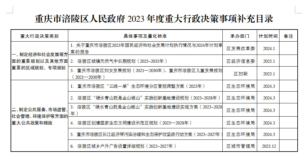 重庆市涪陵区人民政府办公室 关于印发重庆市涪陵区人民政府2023年度重大行政决策事项补充目录的通知