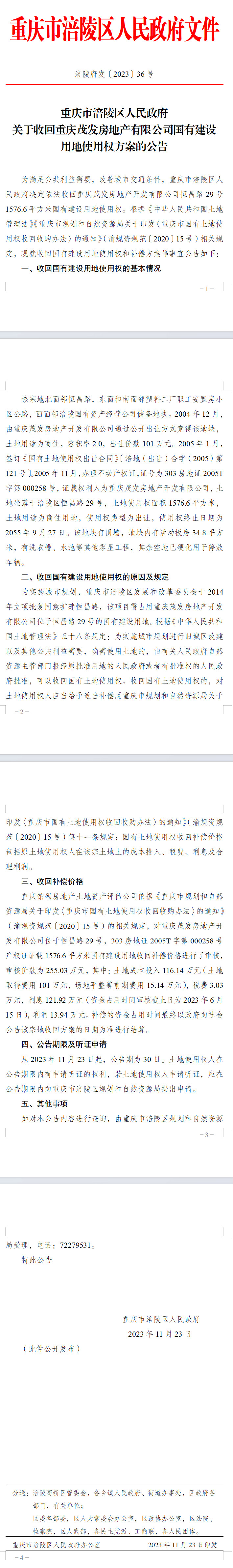 重庆市涪陵区人民政府关于收回重庆茂发房地产有限公司国有建设用地使用权方案的公告