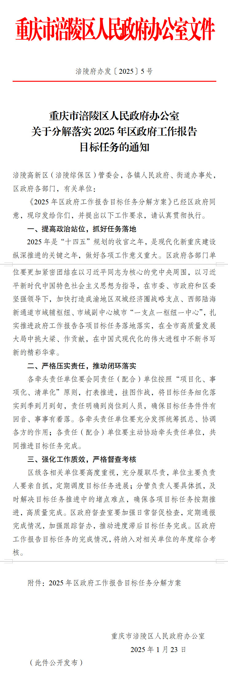 重庆市涪陵区人民政府办公室 关于分解落实2025年区政府工作报告 目标任务的通知