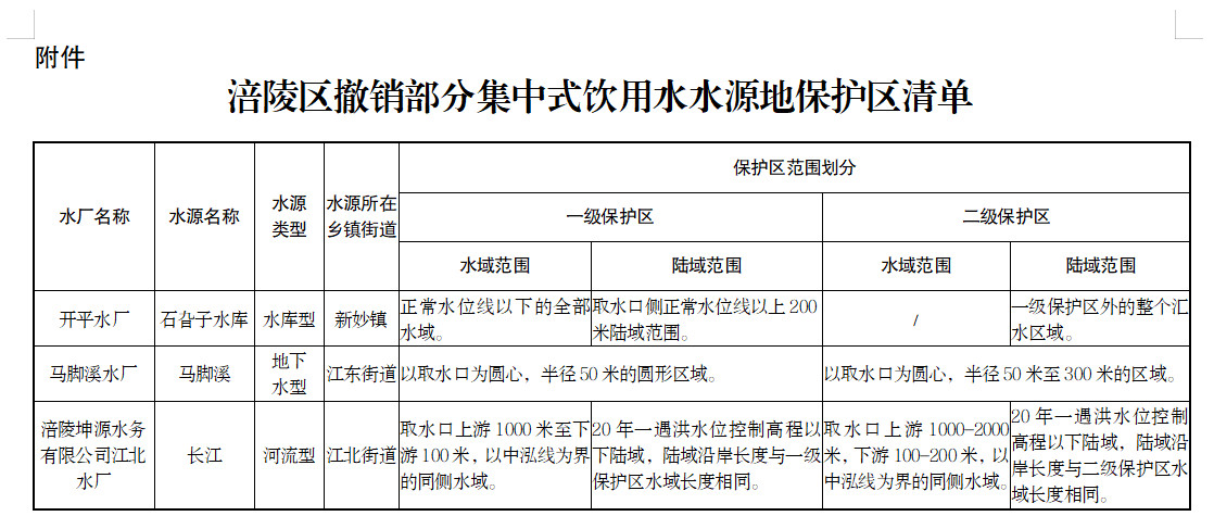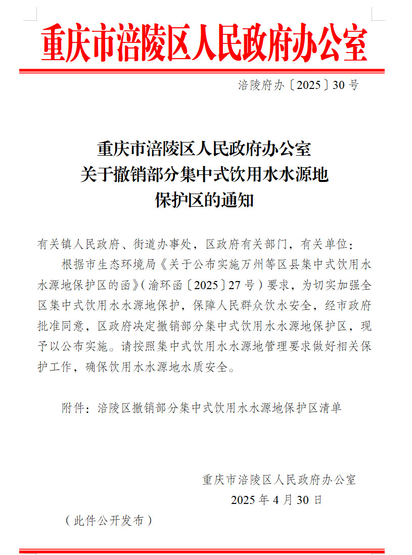 重庆市涪陵区人民政府办公室 关于撤销部分集中式饮用水水源地 保护区的通知