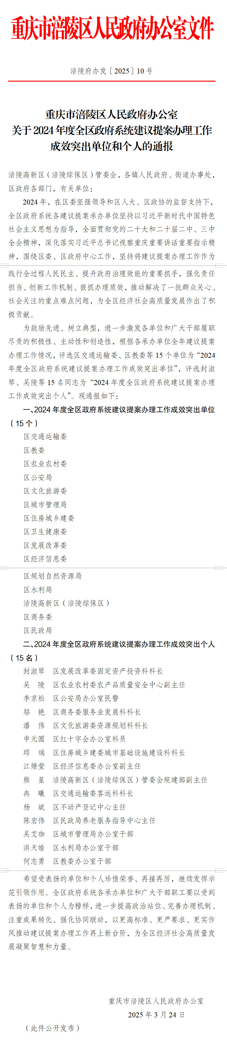 重庆市涪陵区人民政府办公室 关于2024年度全区政府系统建议提案办理工作 成效突出单位和个人的通报